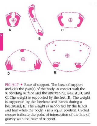 Base of Support is the area between an object's contact surfaces with a resistive surface (supporting surface) that counters the object's CG to move closer toward the center of the earth's mass.